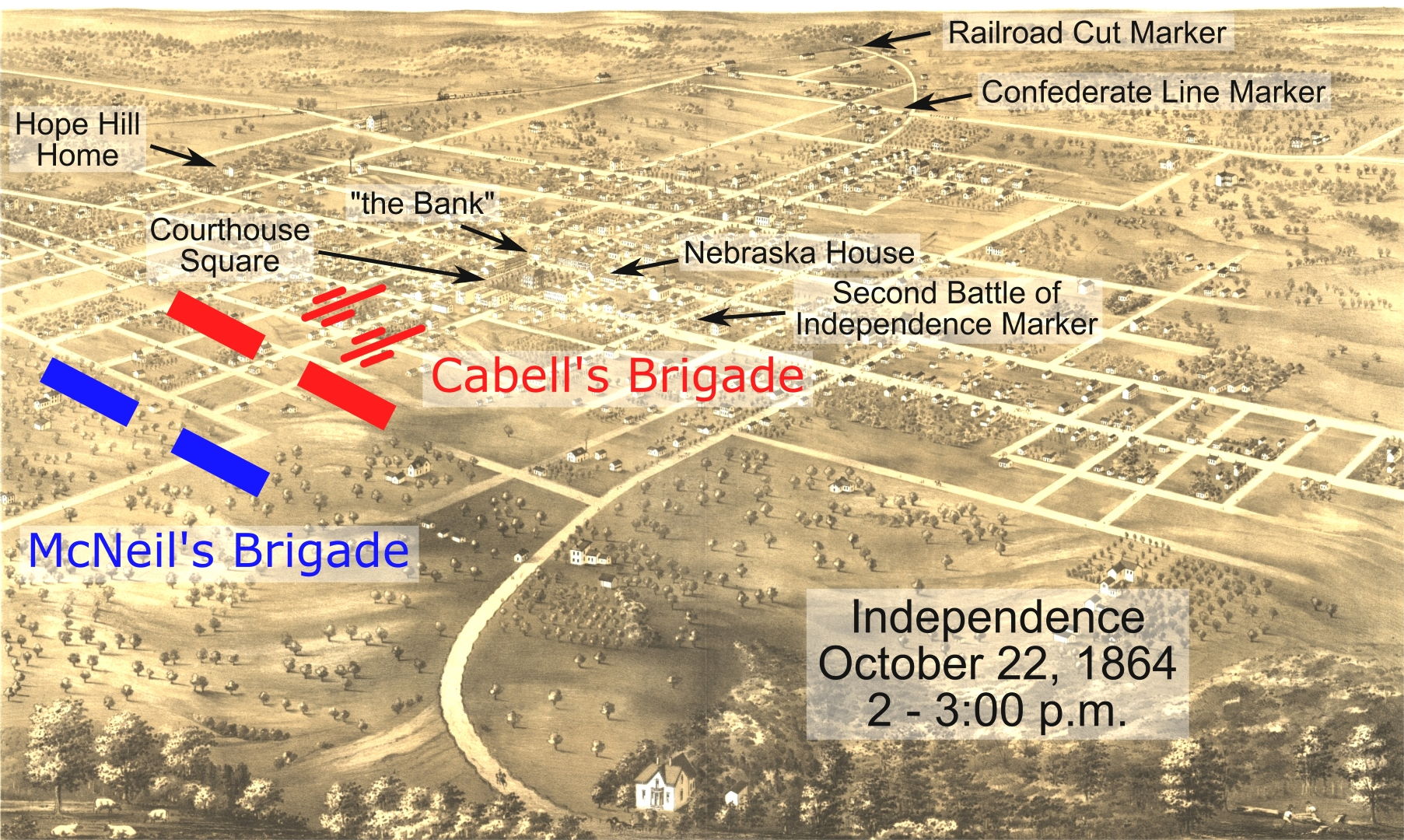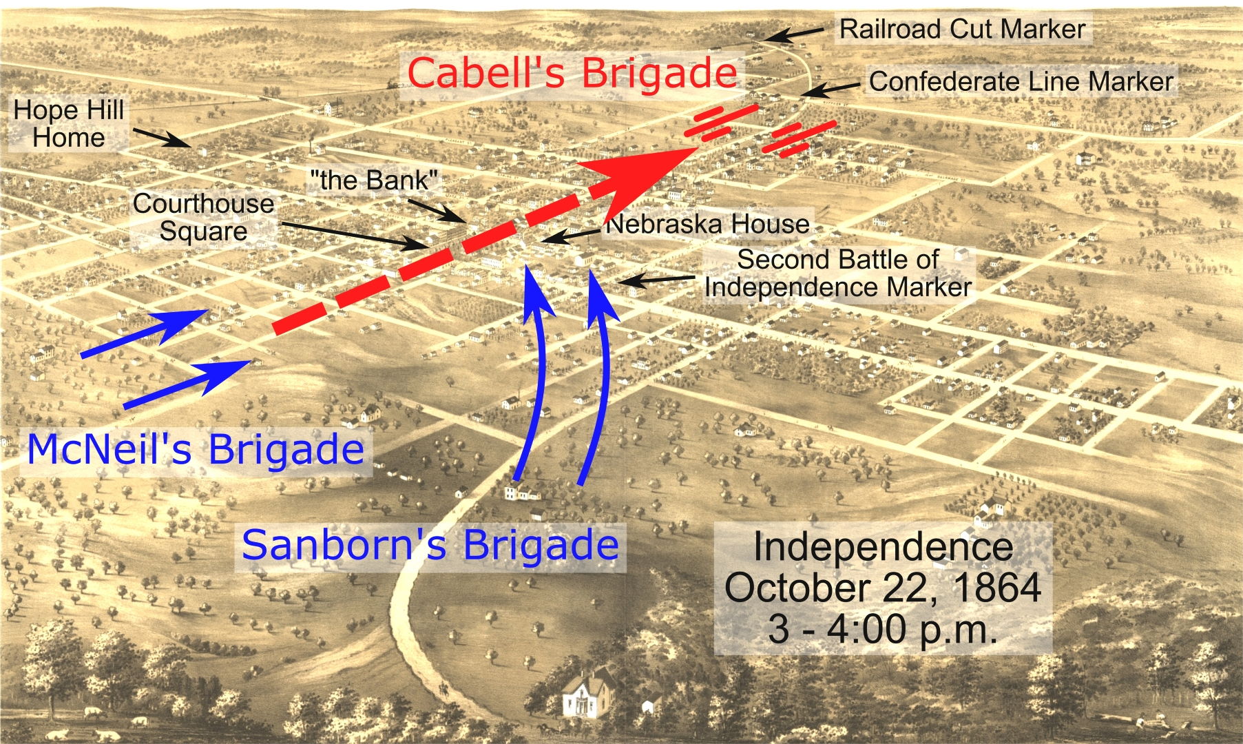 It was heavy going for McNeil because of the enemy artillery fire but McNeil’s troopers were able to push the Confederate back to the outskirts of Independence. McNeil thought his men were tiring and so sent back the call for reinforcements. General Pleasonton ordered Brig. Gen. John B. Sanborn forward with his brigade. Cabell fell back into the center of Independence and set up his defense line.
