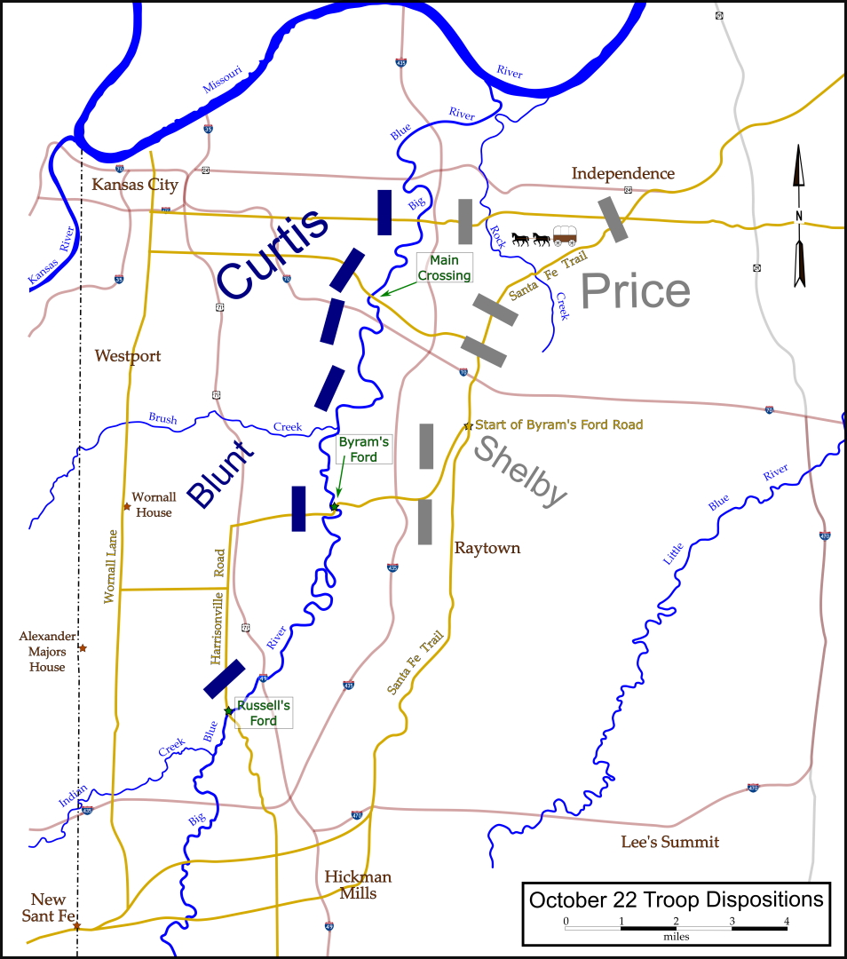 Maj. Gen. Samuel R. Curtis, the Federal commander in Kansas, had established a defense line along the Big Blue River. Curtis deployed his forces from where the Big Blue flows into the Missouri River upriver to Russell’s Ford, a distance of over 12 miles. Curtis deployed his forces to guard the river crossings but neglected to post troops on some little-known fords.